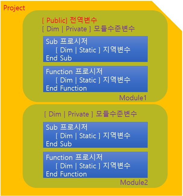 전역변수(Public) : 프로젝트 내 , 표준 모듈에서만 선언 가능