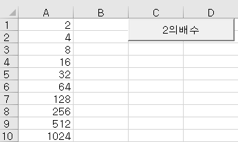 | Private Sub 입력_Click() Dim arr() As Double Dim i, n, m As Integer '2의거듭제곱 출력 갯수 입력 i = InputBox("숫자를 입력하시요") ReDim arr(1 To i) For n = 1 To i arr(n) = 2 ^ n Next n For m = 1 To i Cells(m, 1).Value = arr(m) Next m End Sub |