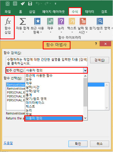 수식 > 함수 라이브러리 > 함수 삽입 > 범주 선택 : 사용자 정의 함수