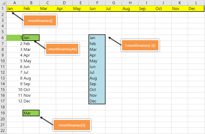 | Function MonthNames(Optional MIndex) Dim AllNames As Variant Dim MonthVal As Long AllNames = Array("Jan", "Feb", "Mar", _ "Apr", "May", "Jun", "Jul", "Aug", _ "Sep", "Oct", "Nov", "Dec") If IsMissing(MIndex) Then ' 인수 미전달시 배열 전체 전달(가로방향 배열) MonthNames = AllNames Else Select Case MIndex Case Is >= 1 ' 인수가 1이상의 정수이면 인수값에 해당하는 값 반환 ' Determine month value (for example, 13=1) MonthVal = ((MIndex - 1) Mod 12) MonthNames = AllNames(MonthVal) Case Is <= 0 ' 0 이하의인수전달시 transpose 적용 반환 MonthNames = Application.Transpose(AllNames) End Select End If End Function |